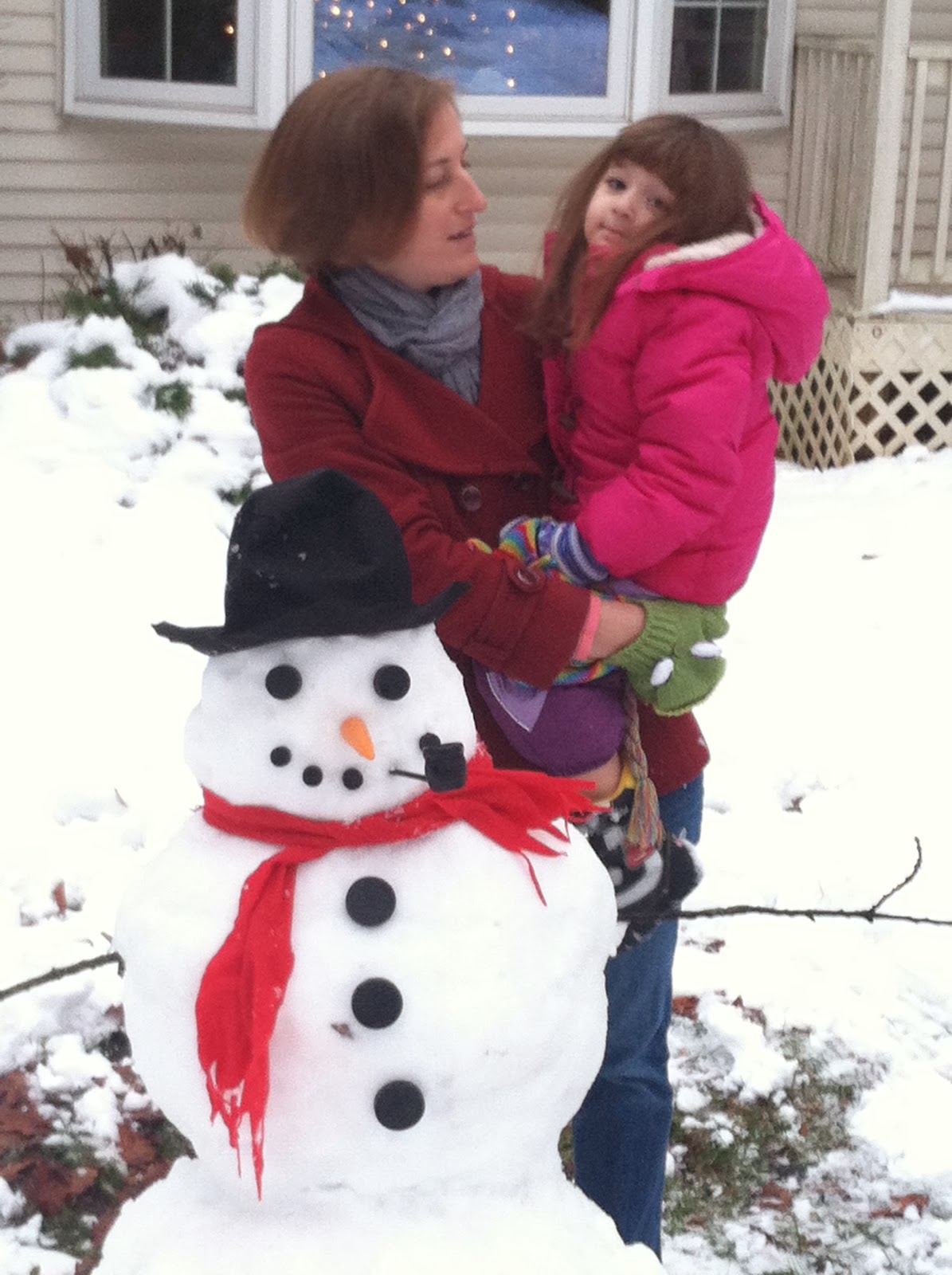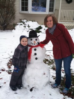 I ran out this afternoon to do a few errands and I was surprised to see the kids and Daddy in the front yard. As I pulled in the driveway, I rolled the window down and asked “What are you guys doing?” Gillian smiled and said “We’s making a snowman!” We attempted to make a snowman on Friday when we were out in the snow. But the snow was too dry. It wasn’t good packing snow. It had warmed up today and the snow melted a little and made it easier to make a snowman. Daddy and John worked on making the body of the snowman, while Gillian just walked around. I helped her find a couple of sticks for arms and she told me “We need a carrot for him’s nose!” I asked Daddy “What else do we need?” Daddy rattled off a list of items and I ran into the house. I remembered that a few years ago Grandma gave us a snowman kit. I found the kit in Gillian’s closet and I went back outside to my family. John immediately questioned me “What’s in the box?” I told him to bring it to Daddy and then he could open it up. Inside were all the pieces to make a perfect snowman, a hat, a scarf, eyes, carrot nose, a pipe, buttons and a mouth. Finally our snowman was complete. John was so proud.