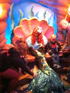 Later that night, we went back to the Magic Kingdom to see a parade and the fireworks. We didn’t end up seeing the parade. We ended up going on a few rides and we got to meet Ariel! Ariel was super nice, even though Gillian was super tired and cranky. She loved Gillian’s autograph book and kept saying that she was happy that Gillian picked a page that matched the color of her tail! Unfortunately, the pictures we took with Ariel didn’t make it on my PhotoPass, but I did get one quick shot on my cell. It’s proof that we met Ariel!