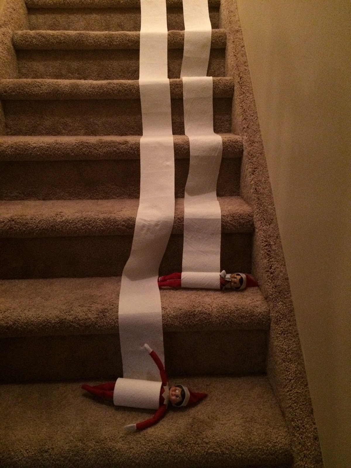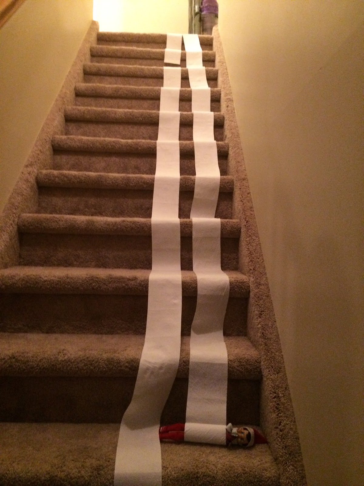 On Friday, December 11th, the toilet paper was missing from the bathroom. I questioned John, and he said “I didn’t go to the bathroom last night. I bet Daddy didn’t replace it.” He immediately ran to the bathroom to investigate, but he saw toilet paper in the hallway and followed the trail down the stairs.
