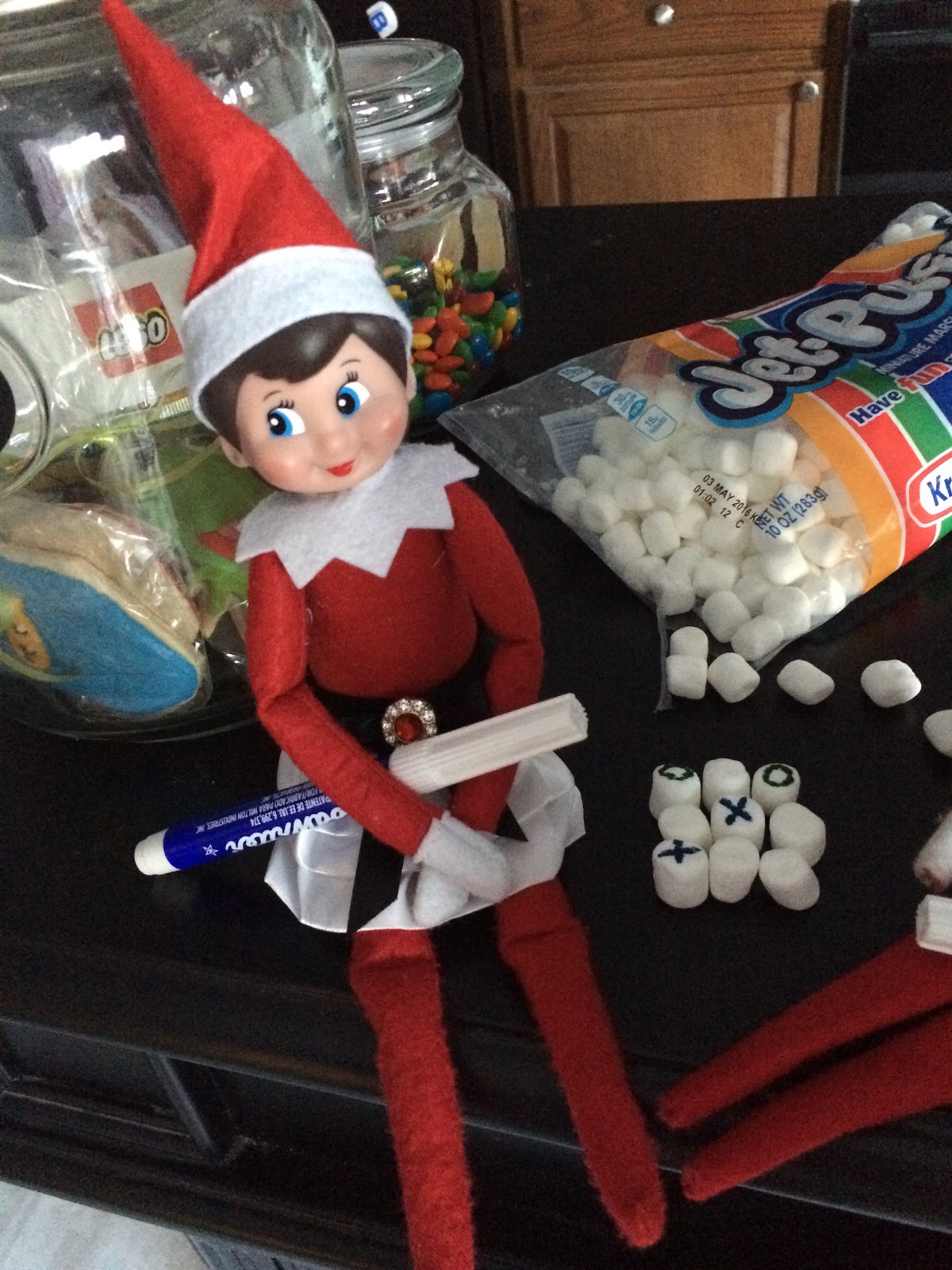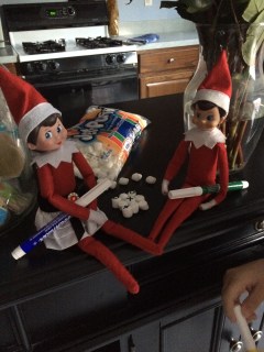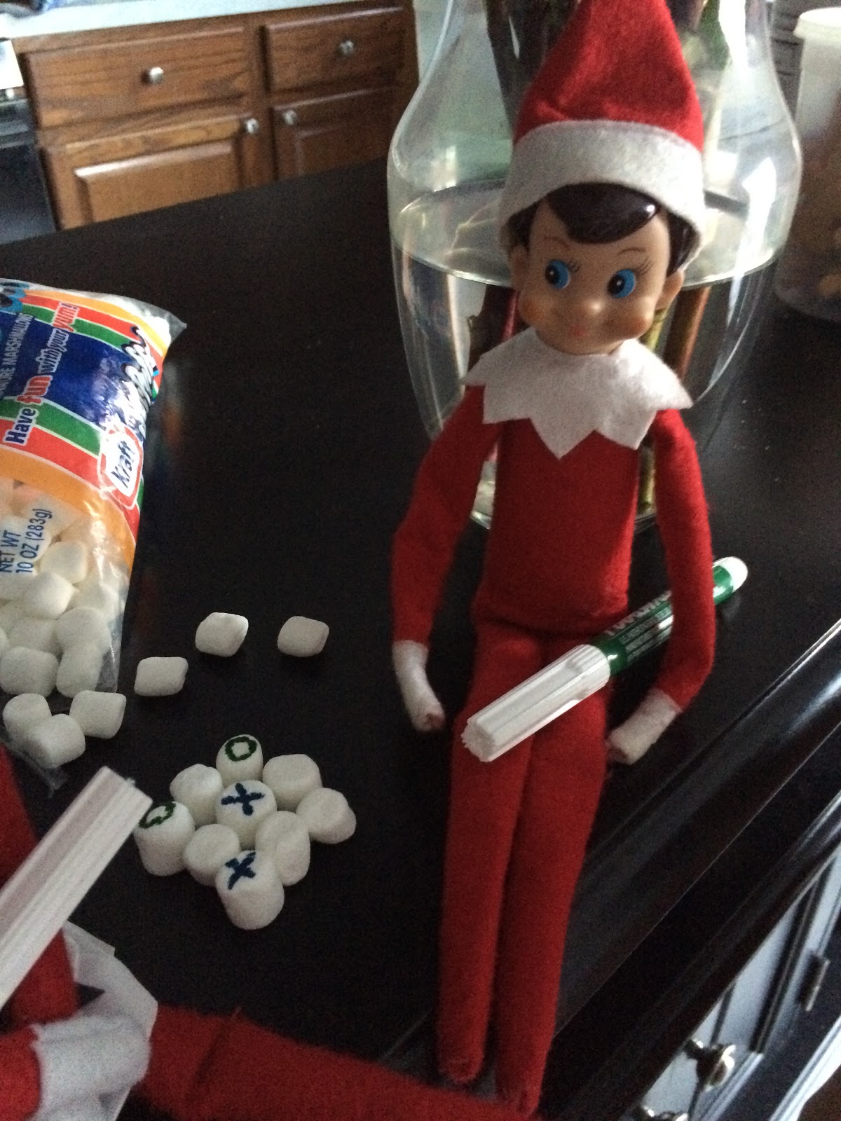 Sunday morning, we found those silly elves in the kitchen. They found Mommy’s food markers and used them to make a tic-tac-toe game out of marshmallows!