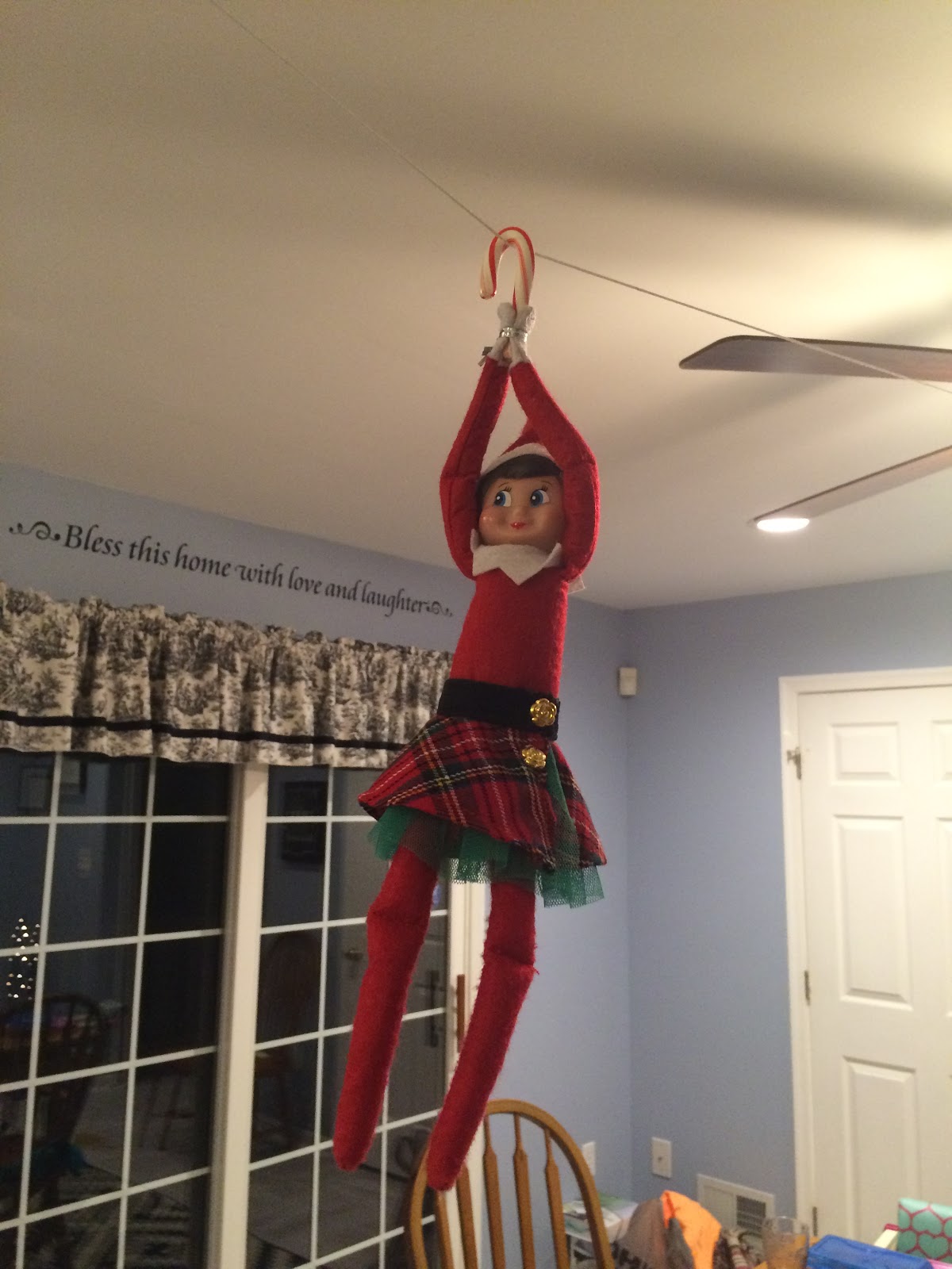 Wednesday morning, we found the elves ziplining in the kitchen using candy canes!