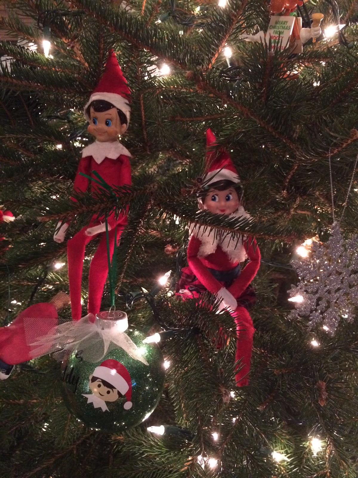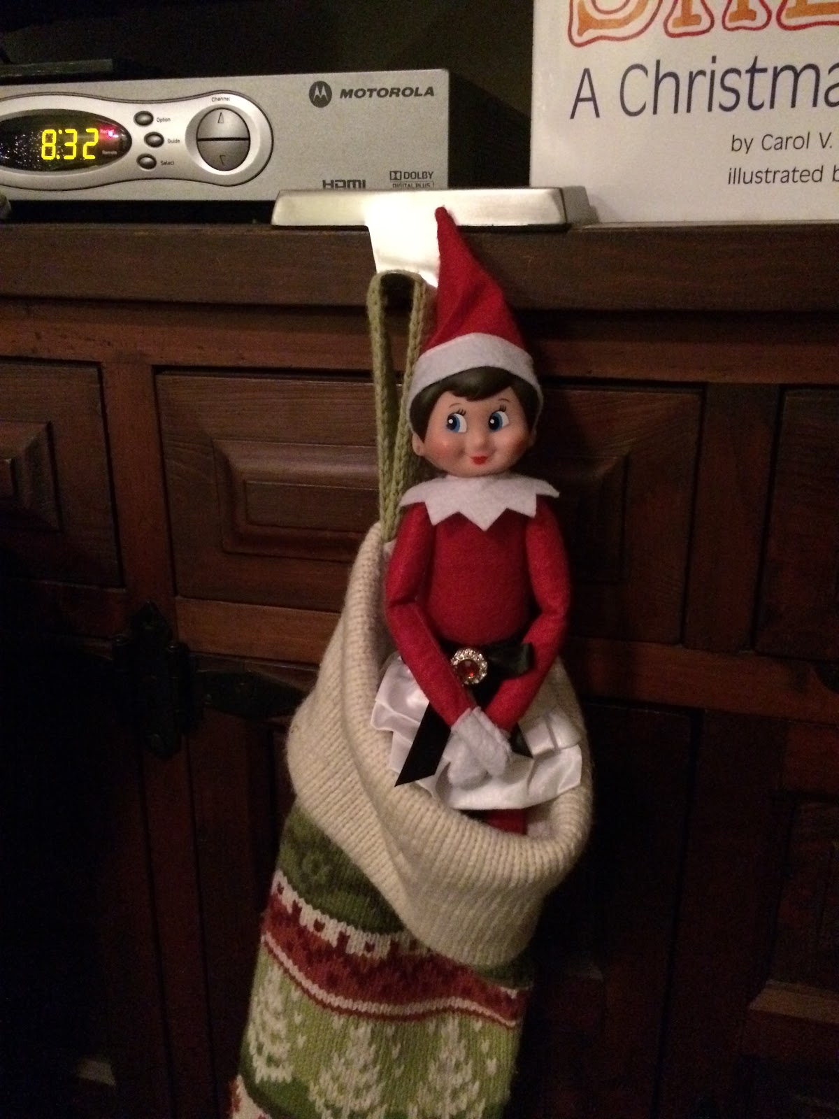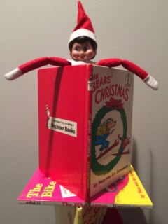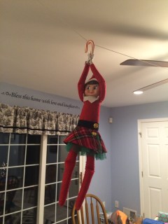 Buddy must have heard John, and the next day the elves hid separately. Buddy was up on a high shelf and Snowflake was just hanging out in Gillian’s stocking.
