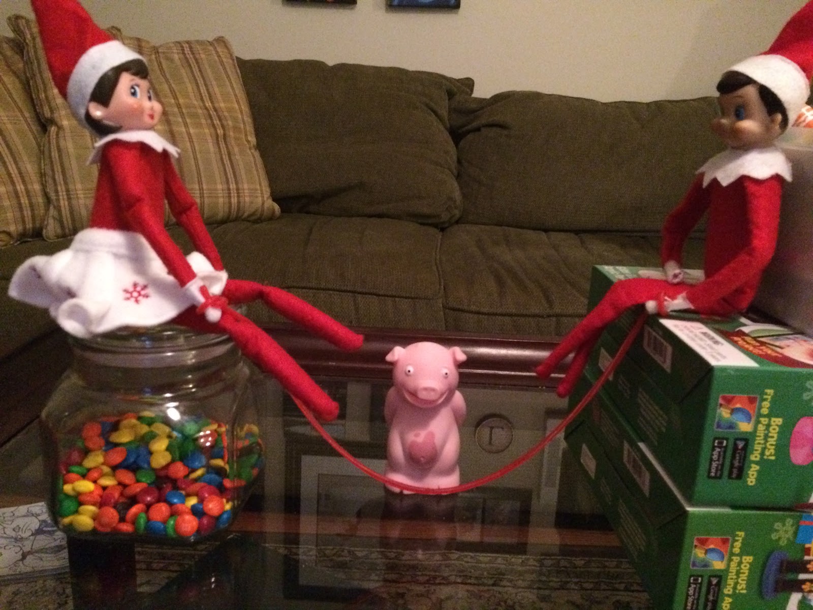 Monday, the elves were back up to their silly antics. They were making a pig jump rope!
