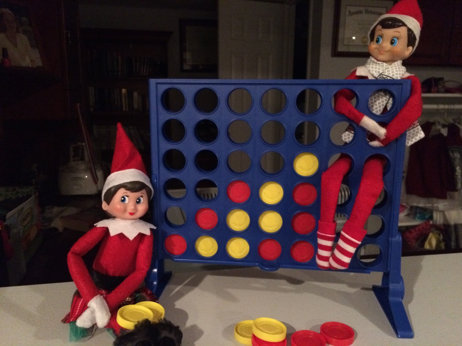 The next day the kids found the elves hanging out in the basement. They were playing Connect 4! Gillian said “Snowflake’s winning! See! Her’s yellow!”