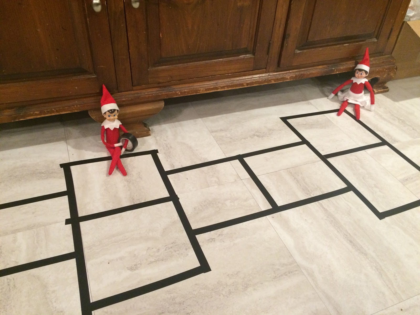 Tuesday morning, we found the elves in the kitchen. They made a hopscotch out of tape on the kitchen floor.
