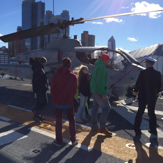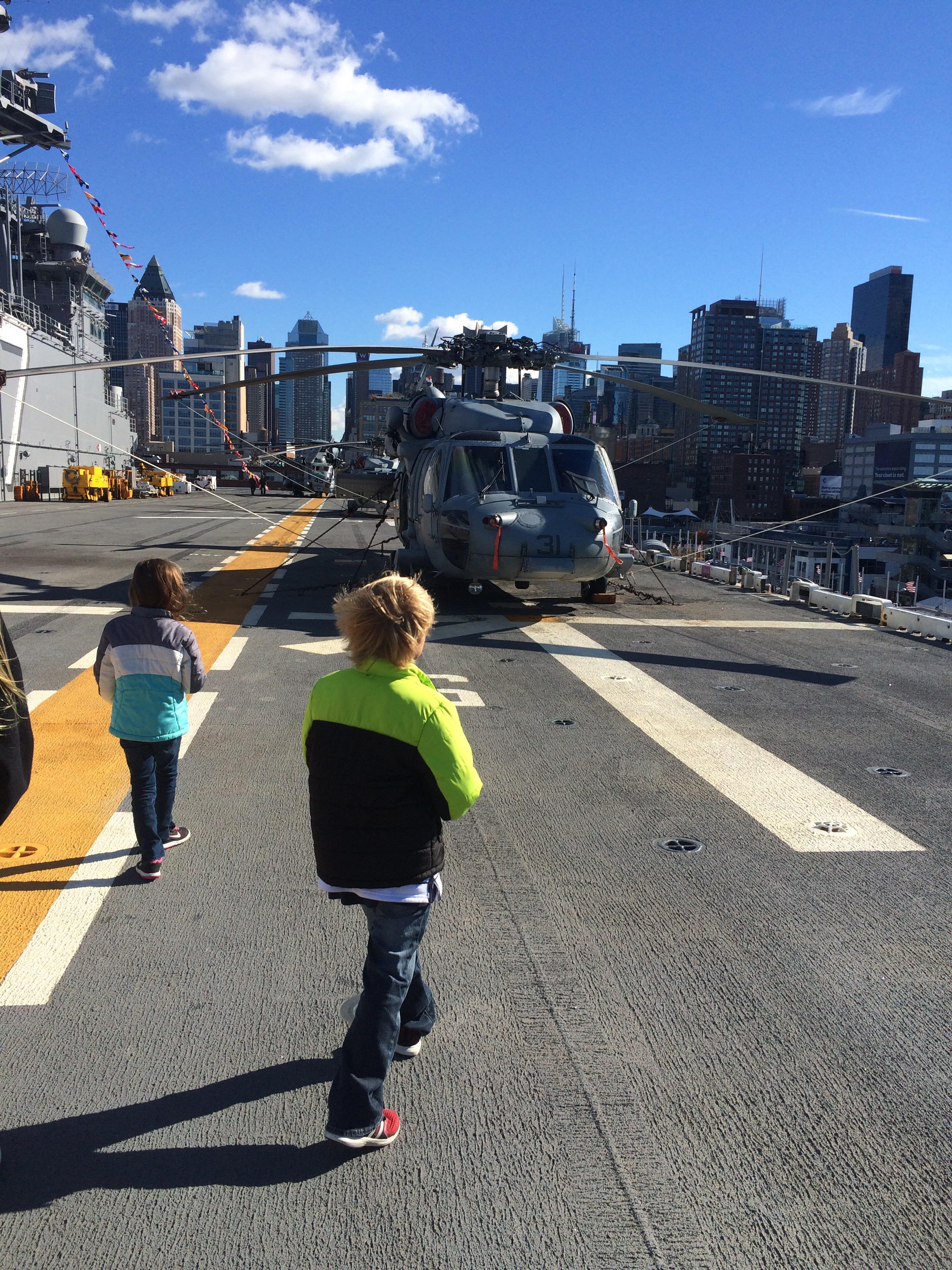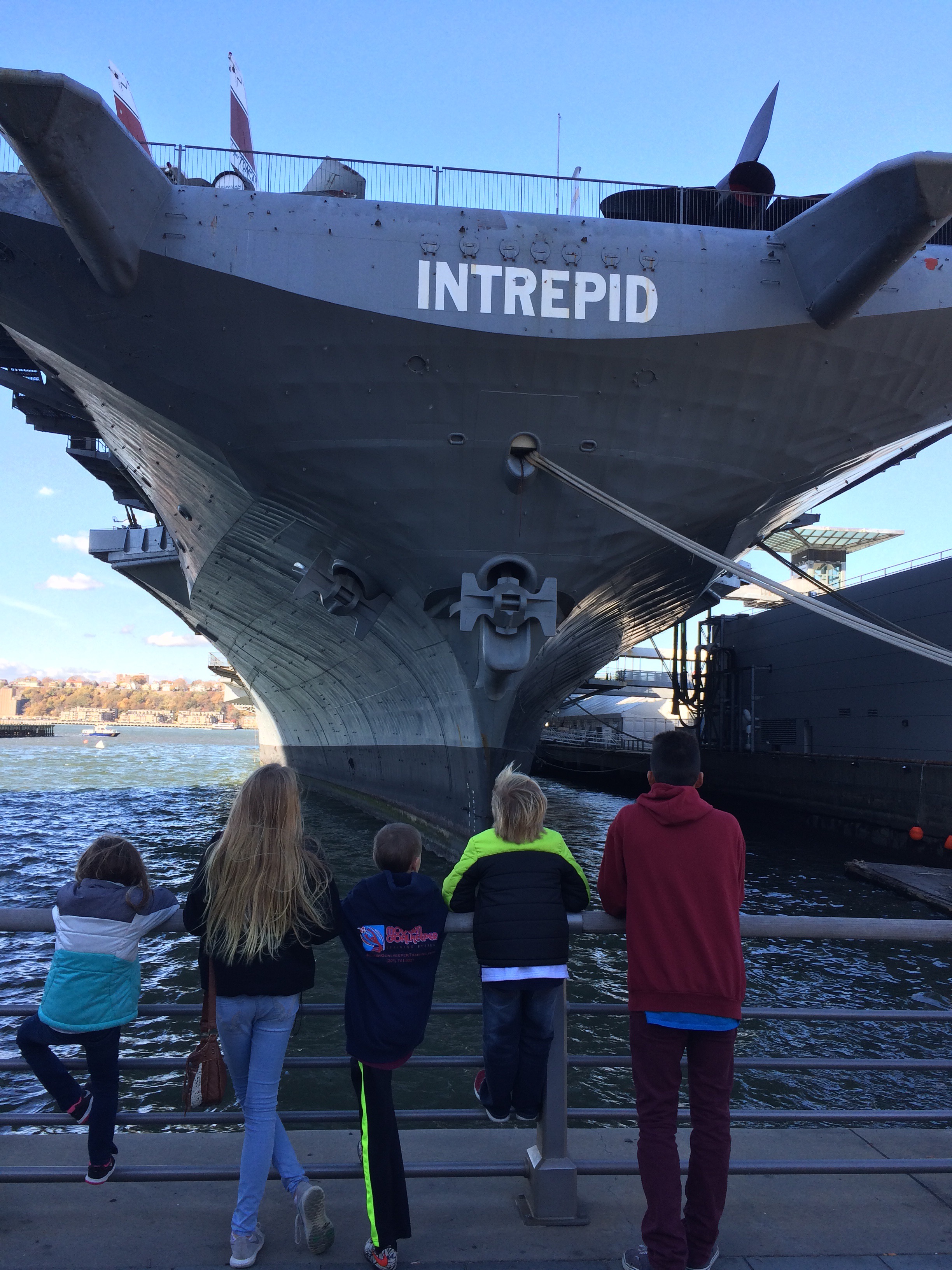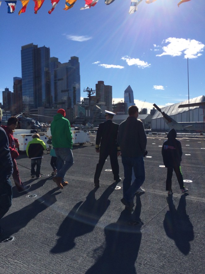 We rented a big van and loaded in five kids and eight adults. The ride into the city was pretty uneventful and everyone was very excited to arrive. We walked past the Intrepid on our way to the Iwo Jima.