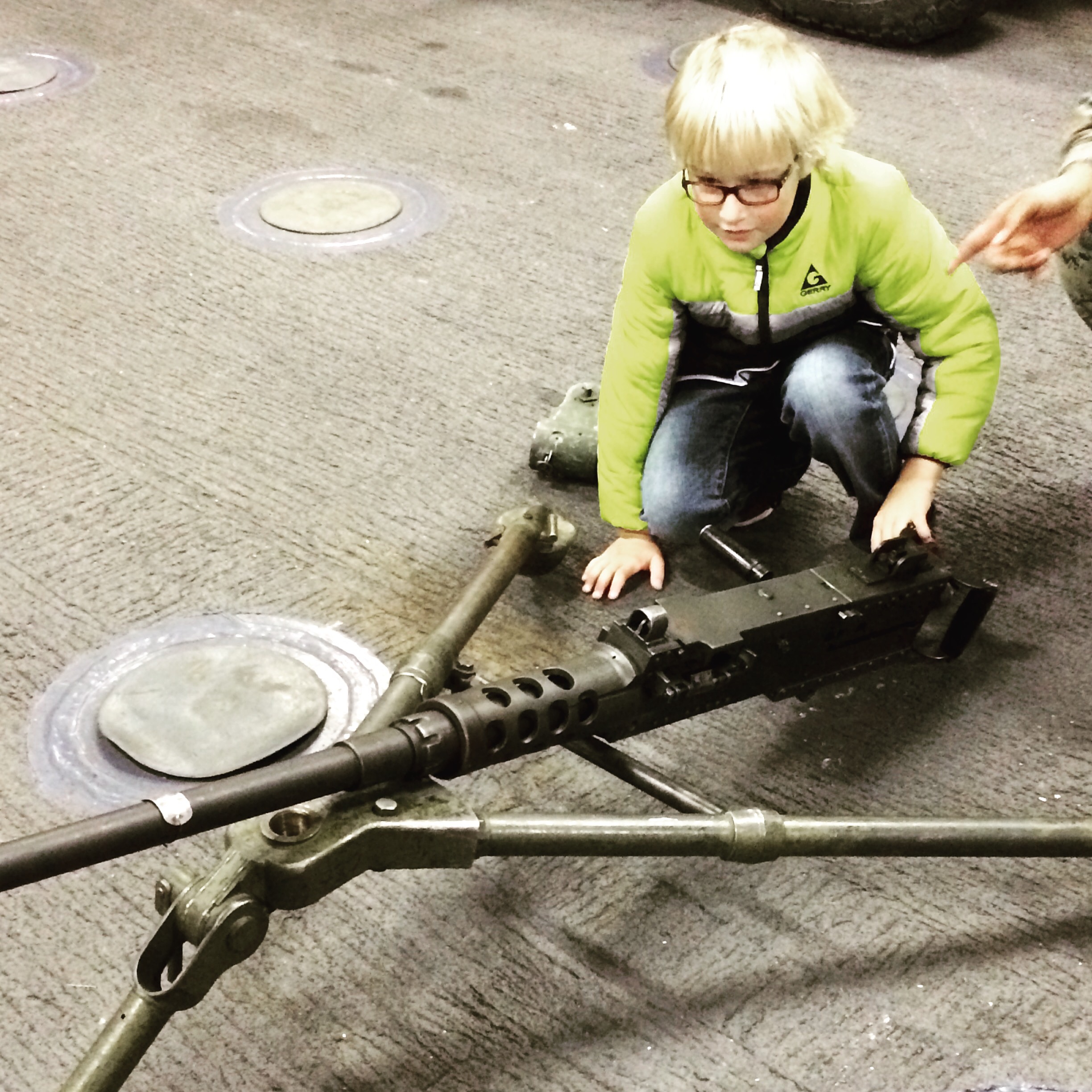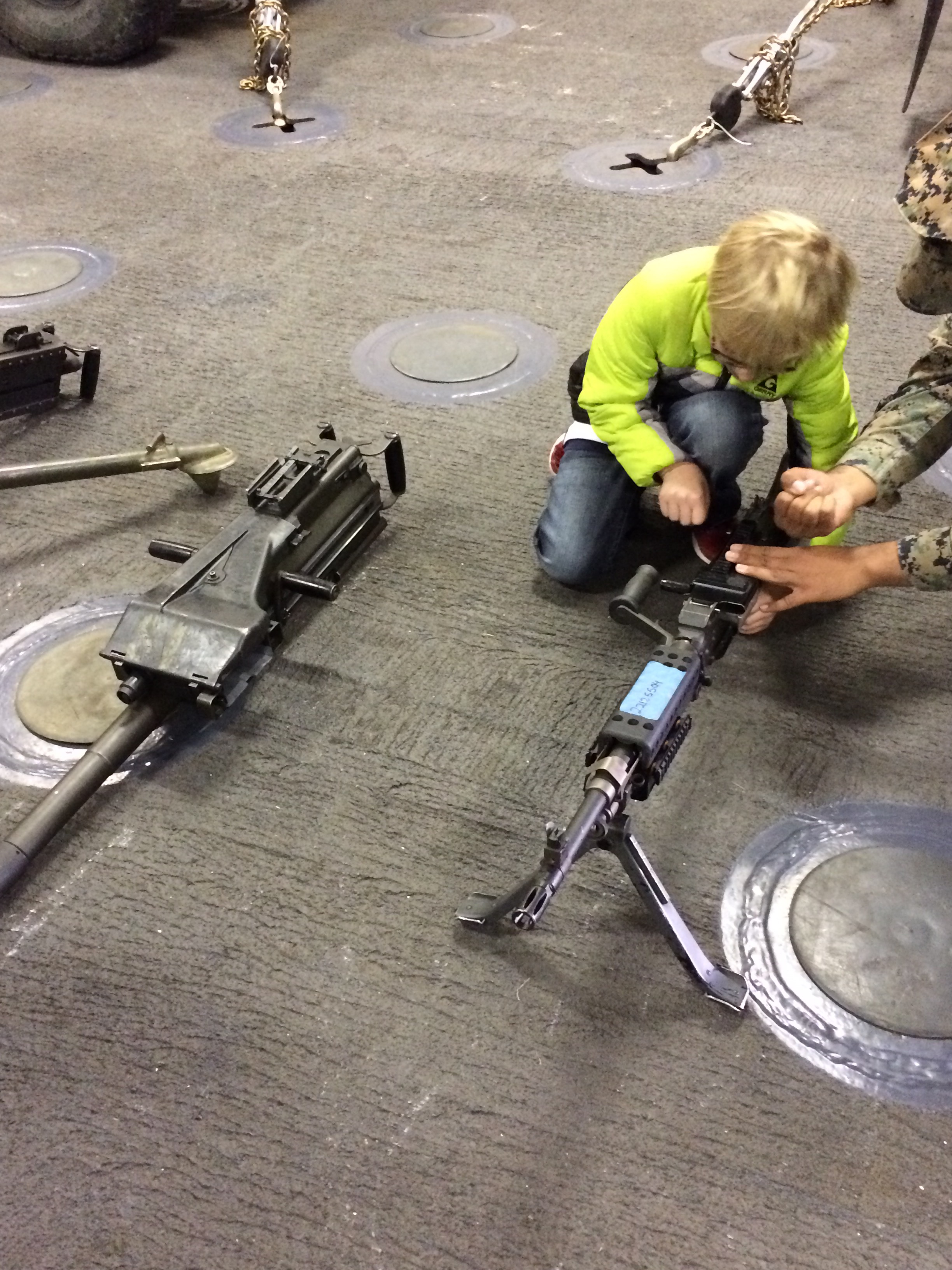 Next some Marines showed us some of the weapons they had on board. This was one of John’s favorite parts of the day. One Marine was very patient with John and showed him every weapon, how to hold it and shoot it.