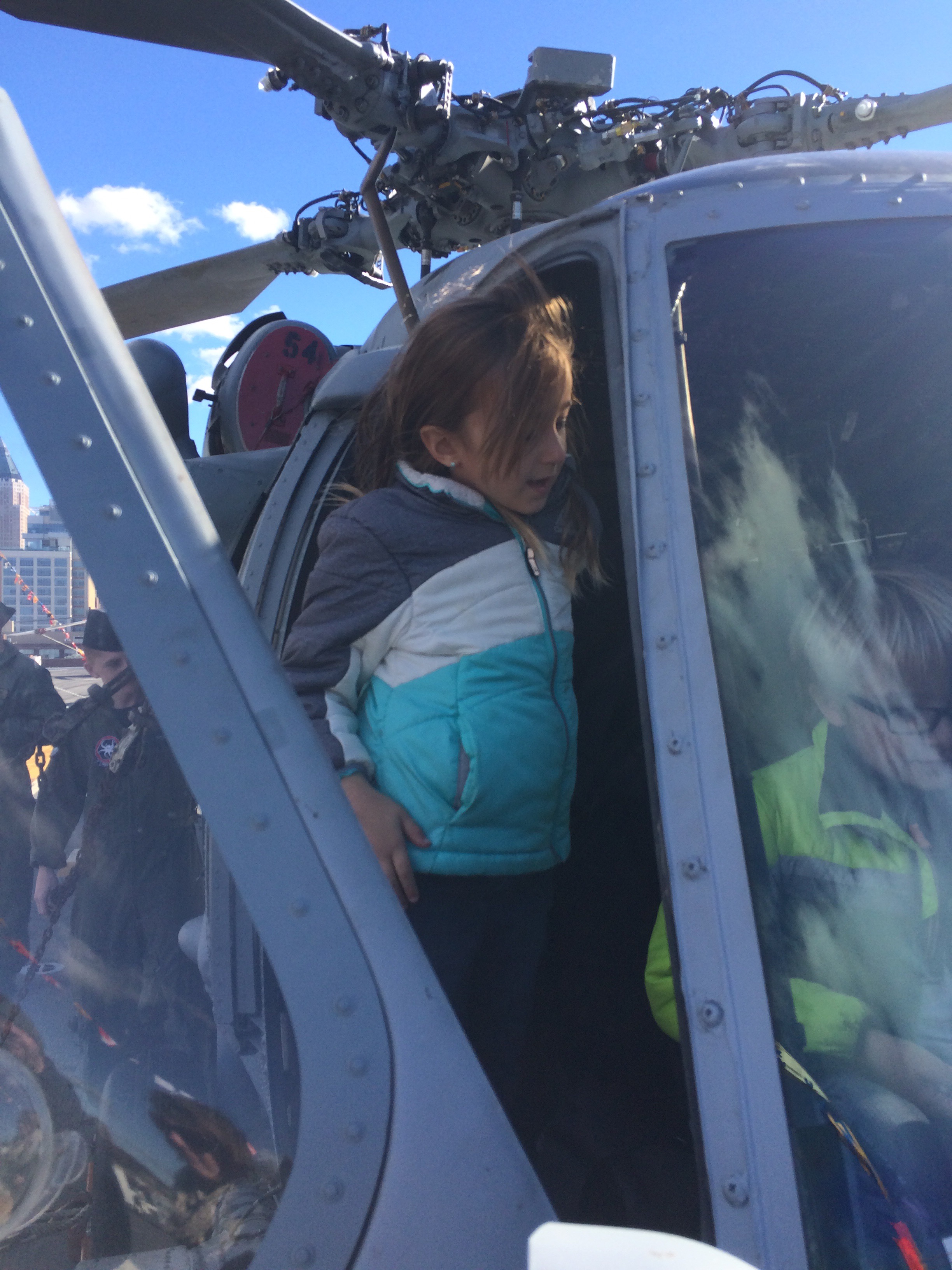 The kids climbed right into this helicopter. John on one side and Samantha on the other. Gillian was able to lean over to check it out too!