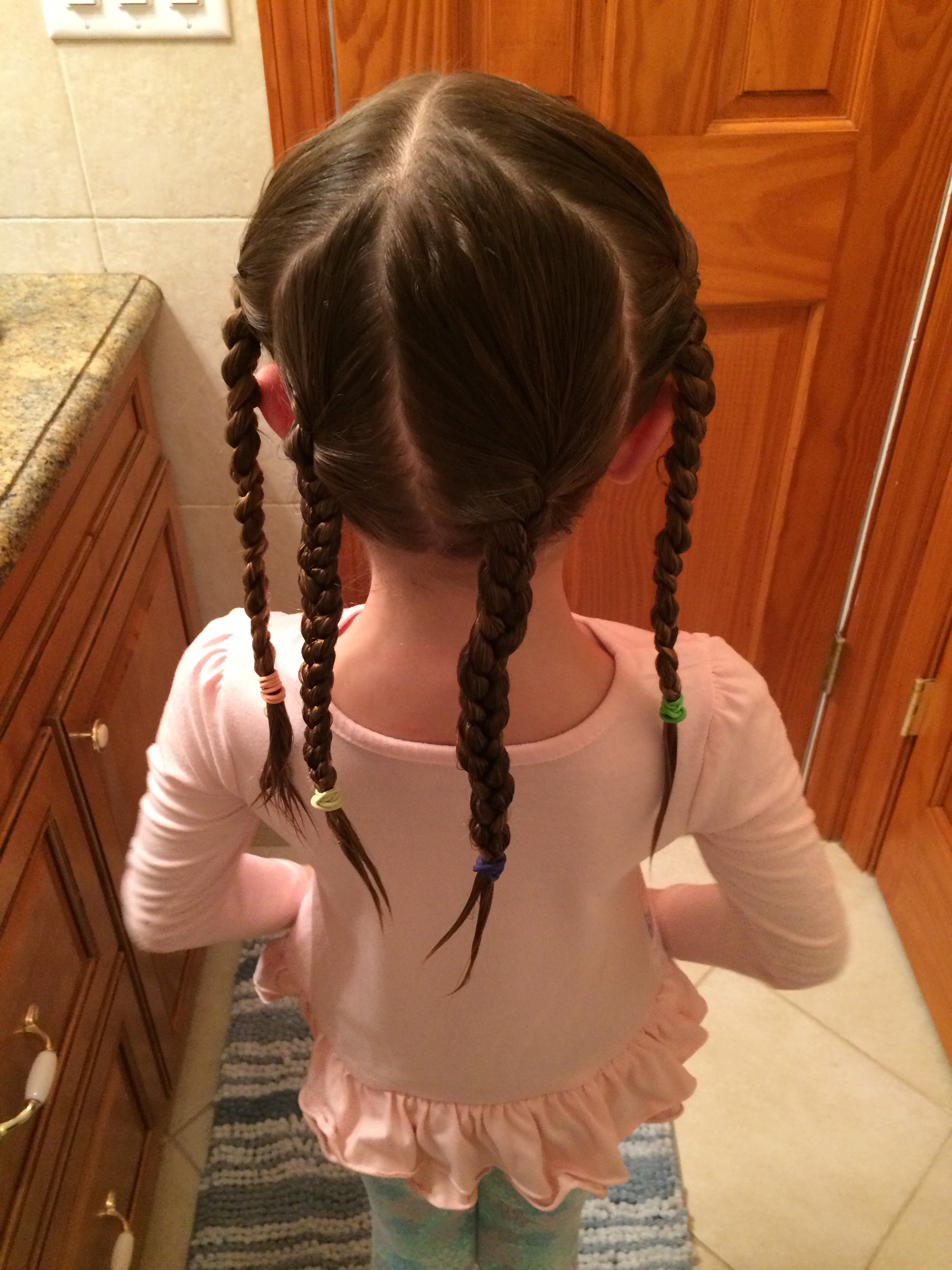 Last night after bath she insisted that I braid her hair again so she would have wavy hair for school. I braided her hair in four braids this time.
