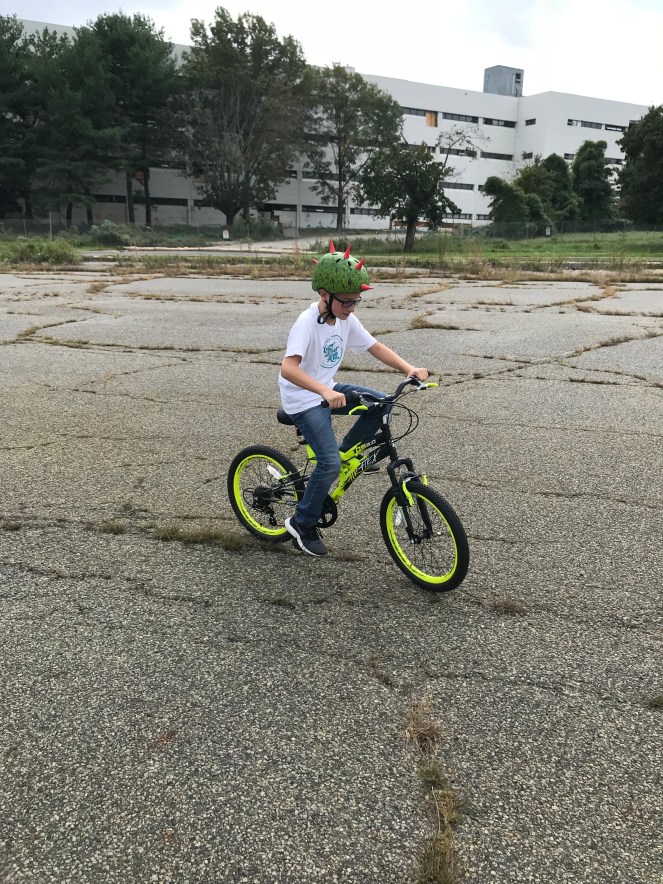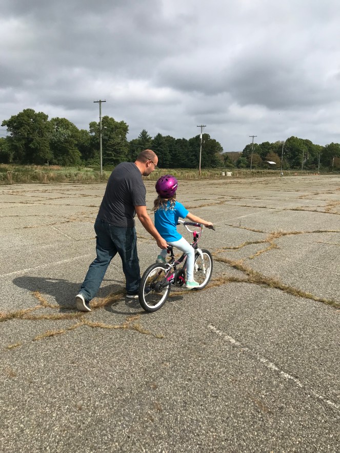 Gillian needed to learn how to ride her bike without training wheels. So we took the kids over to an empty parking lot on the old Fort Monmouth base. John rode his bike back and forth while Daddy worked with Gillian.